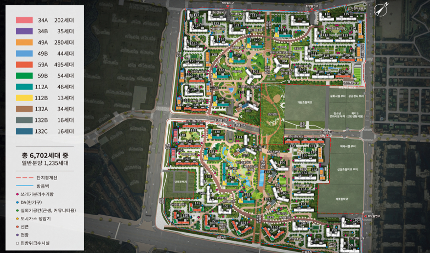 - 6702세대(지하4층, 지상 35층, 74개동)